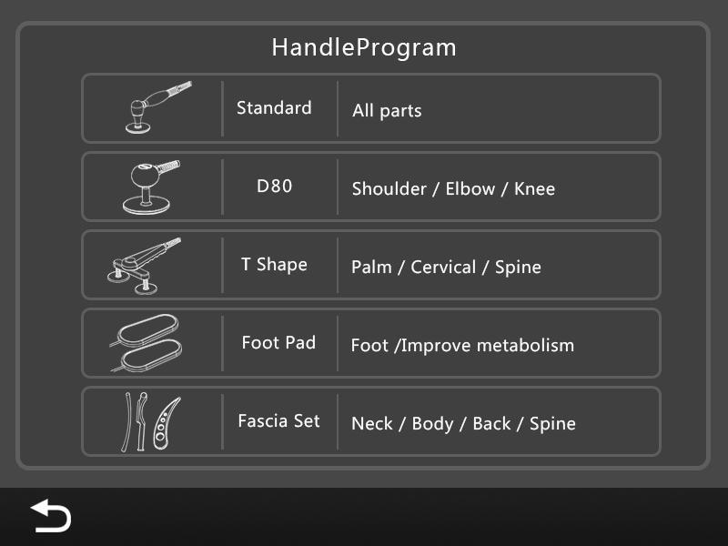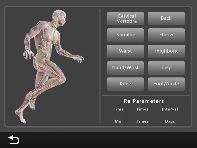 • Izbira 10 delov telesa in prikaz protokolov zdravljenja: priporočeni protokoli zdravljenja so prikazani za vsak del telesa posebej.